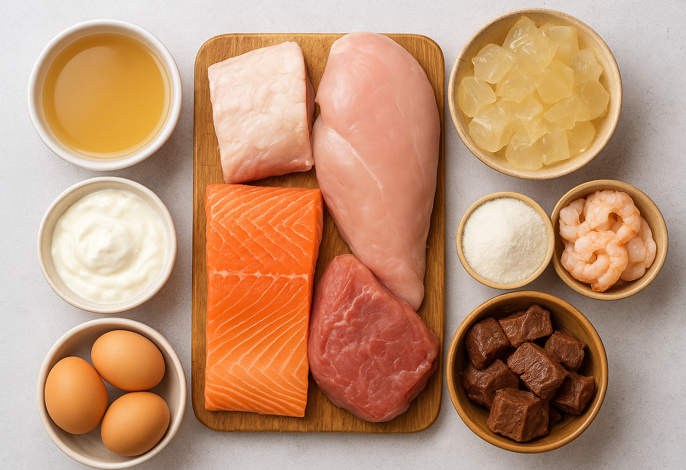 콜라겐 자체가 풍부한 음식: 소고기, 돼지껍질, 닭발, 생선 껍질, 젤라틴 콜라겐 합성을 돕는 음식: 비타민C 풍부한 감귤류, 베리류, 토마토, 파프리카, 녹황색 채소 콜라겐 분해 억제 음식: 항산화 성분이 많은 견과류, 아보카도, 마늘, 녹차 즉, 단백질 + 비타민C + 항산화 성분을 균형 있게 섭취하는 것이 가장 중요합니다. 음식을 통한 꾸준한 관리가 건강한 피부와 관절, 그리고 젊은 활력을 유지하는 핵심 포인트입니다.